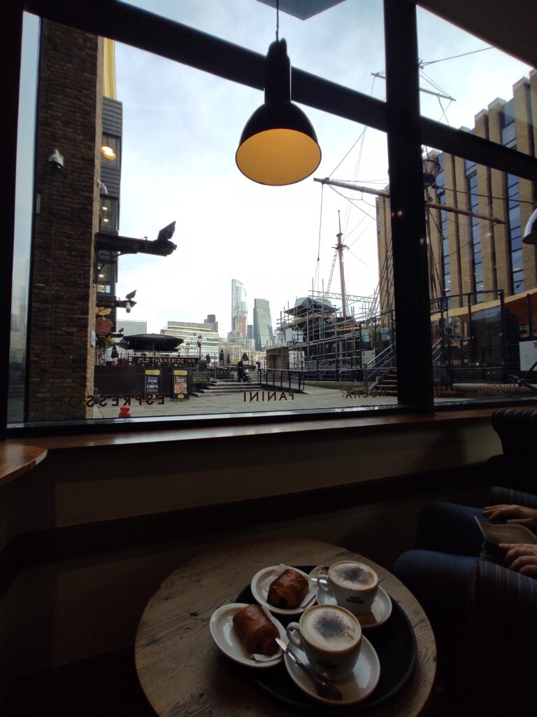 Dos caputxinos i dos panets amb xocolata. Café Nero amb vistes al pub Old Thameside inn, el Ghurkin i la llauna…han passat tres anys des de la meva última visita. EMA encara estava a London, the Dockers eren la nostra casa temporal aquella visita. London era meravellós, llavors i ara. Les pedres es queda, la vida canvia.